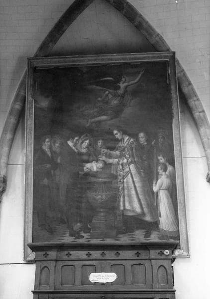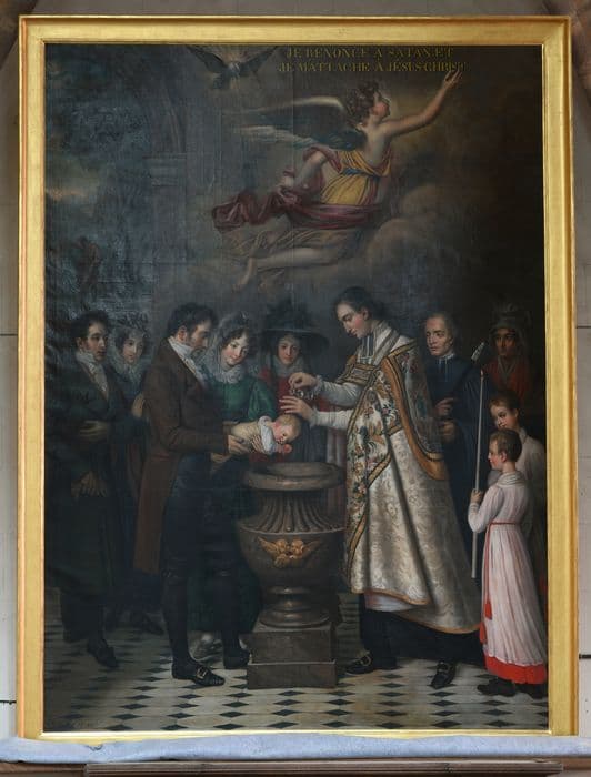 tableau : Le Baptême d'un nouveau né de la famille de Grainville par l'abbé Morin, curé de Mortain