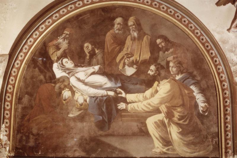 Atelier Pierre Laure (restauration Anna Senac), mars - avril 1993. Interventions antérieures : première intervention en 1930 par Michel Adrien Servant : inclusions de gazes collées sur l'enduit dans les zones lacunaires des angles ayant beaucoup souffert de l'humidité. Les mastics sont débordants sur l'original, sans mise à niveau, en empâtement. Les zones où la toile originale est déplaquée du mur, ont été clouées en particulier autour de l'arcature et autour des pièces dans les angles. Les repeints sont à l'huile, largement débordants, soit sur un mastic très dur et cassant (non identifié), soit directemnet sur l'original pour masquer des tout petits points d'usure. Deuxième intervention dans les années 1960 par l'entreprise Baudoin : reprises d'enduits mal intégrés, surpeints à l'huile en glaics débordant sur l'original. Intervention 1991 Atelier Pierre Laure : Etude, dépoussièrage, nettoyage à l'eau, tests de dévernissage, tests de dégagement des repeints et mastics. Etat en 1993 : toile a souffert de l'humidité, chancis sur l'ensemble de la peinture à l'exception des parties claires, zones d'écaillages en cuvette, quelques déplacages de toile, ensemble très repeint, lecture difficile. Intervention 1993 Atelier Pierre Laure : traitement de la sruface (nettoyage, allègement du versnis, allègement des repeints, des mastics, des gazes), traitement du support : refixage, traitement des chancis, des inclusions, ragréage et mise à niveau d'un enduit de surface, vernis d'isolation de l'original, réintégration des lacunes et des usures de la couche picturale.