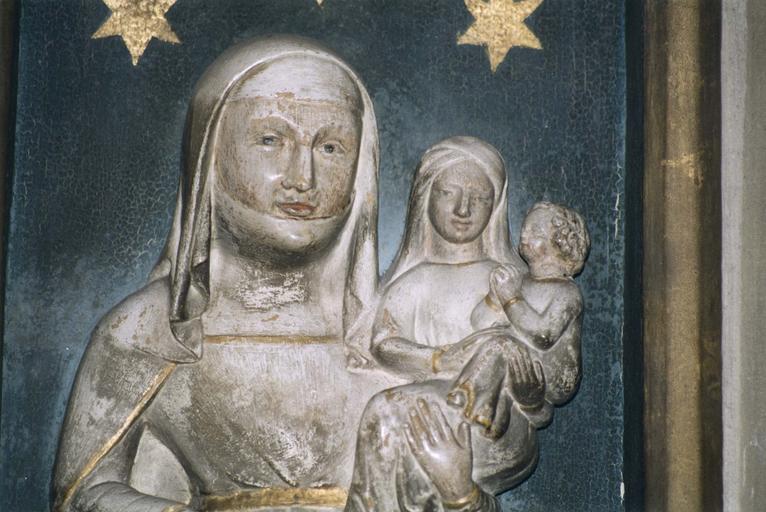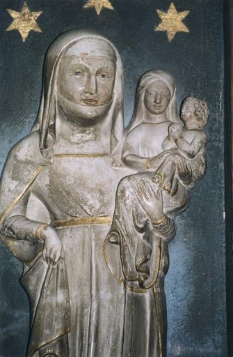 Haut-relief en pierre sculptée et peinte, représentant sainte Anne, debout. Elle porte la Vierge, assise, sur son bras gauche. Celle-ci porte également l'Enfant Jésus, assis mains jointes sur le bras gauche de sa mère. Les personnages se détachent sur un fond peint en bleu et son surmontés par trois étoiles peintes en doré.