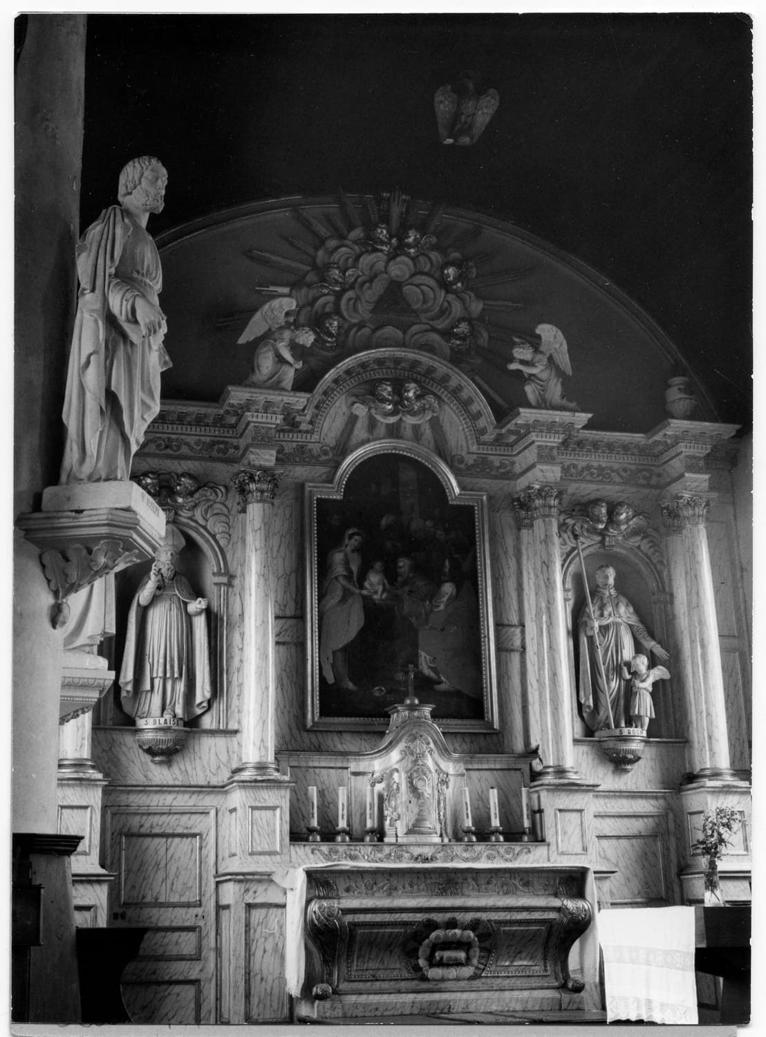 autel ; gradin d'autel ; tabernacle ; retable ; tableau ; statue (2) ; sculpture ; porte (2)