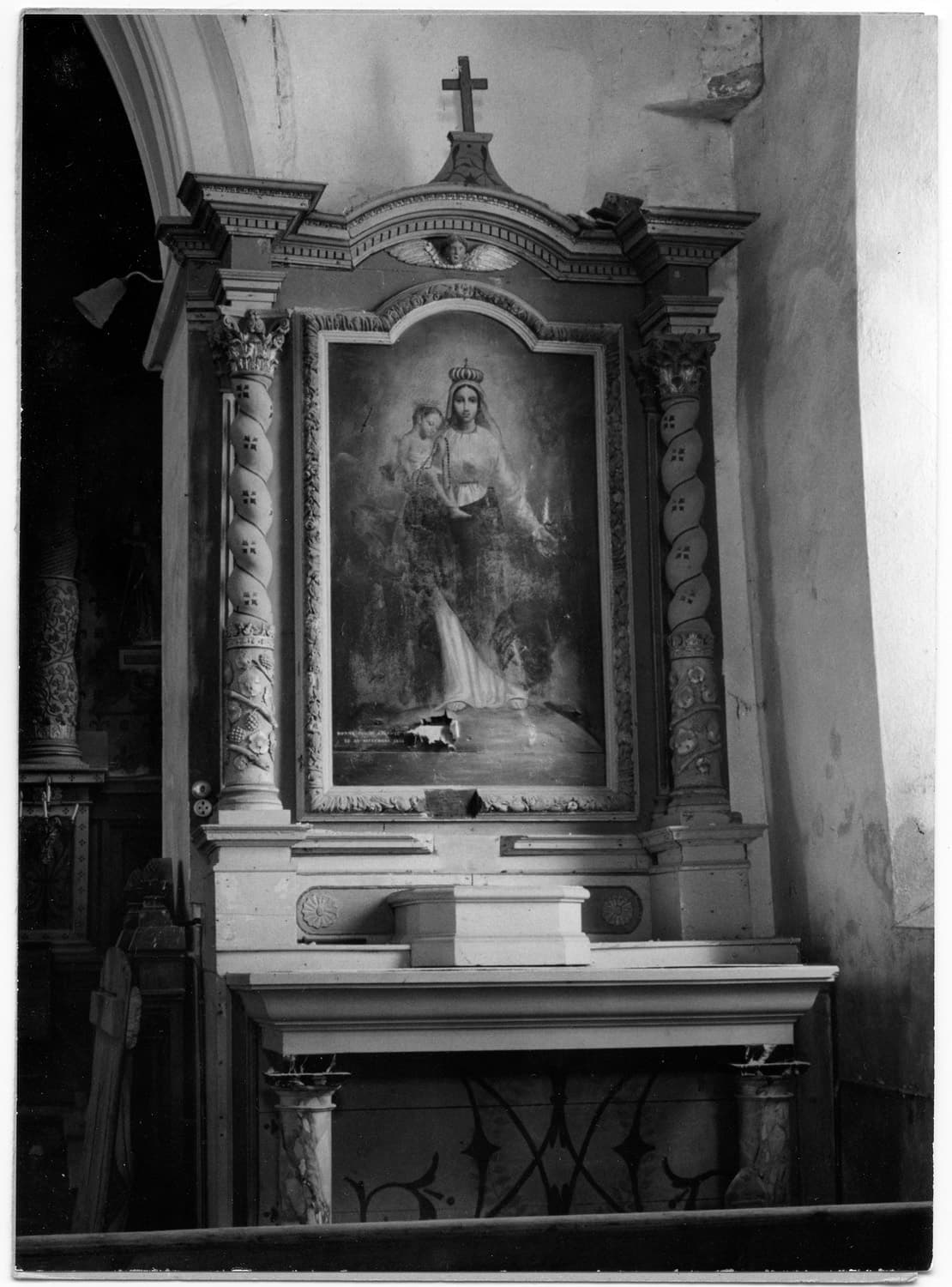 Autel à élévation droite surmonté d'un tabernacle à ailerons, et retable à colonnes torsadées ornées de pampres de vigne sur leur partie basse, avec cadre central mouluré orné de roses. Entablement décoré d'une tête d'angelot.