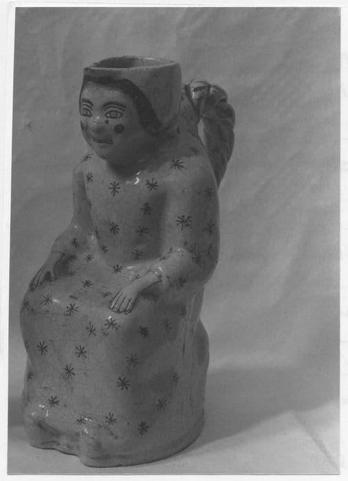 Pichet figurant une femme assise, en faïence de Rennes à décor polychrome.