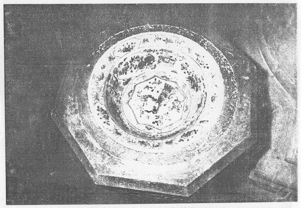 Cuvette (remployée noyée dans un bénitier en ciment vers 1948) en porcelaine blanche à décor chinois polychrome.