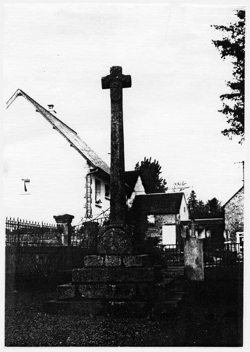 Quatre emmarchements, dé, fût monolithe, croisillon figurant à l'avers le Christ en croix et au revers la Vierge à l'Enfant.