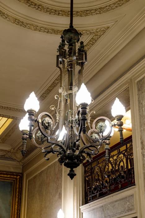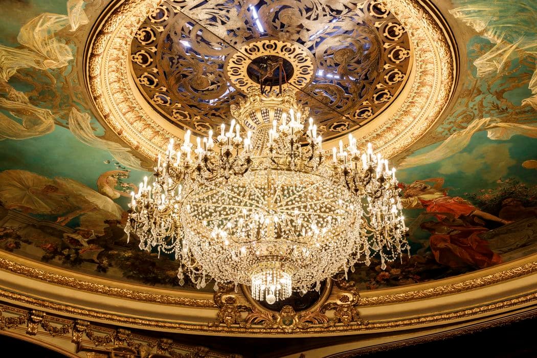 Ensemble comprenant : trois lustres à cinq bras, un lustre à six bras, trois grands lustres du foyer et le grand lustre de la salle centrale.