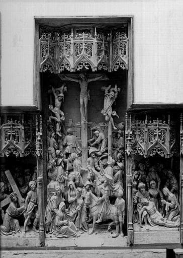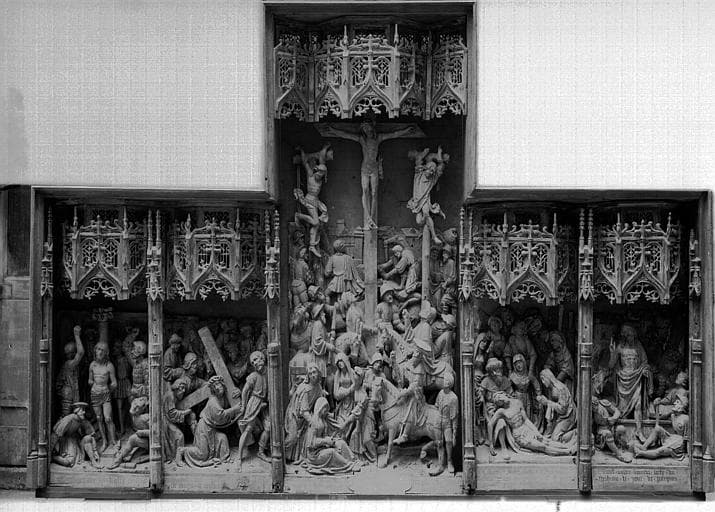 retable : le Christ en croix entre les deux larrons et la pamoison de la Vierge, la Flagellation, le Portement de croix, la Descente de croix, la Résurrection