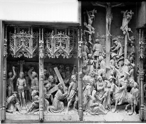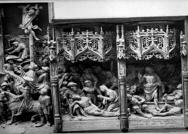POP | Plateforme ouverte du patrimoineretable : le Christ en croix entre les deux larrons et la pamoison de la Vierge, la Flagellation, le Portement de croix, la Descente de croix, la Résurrection