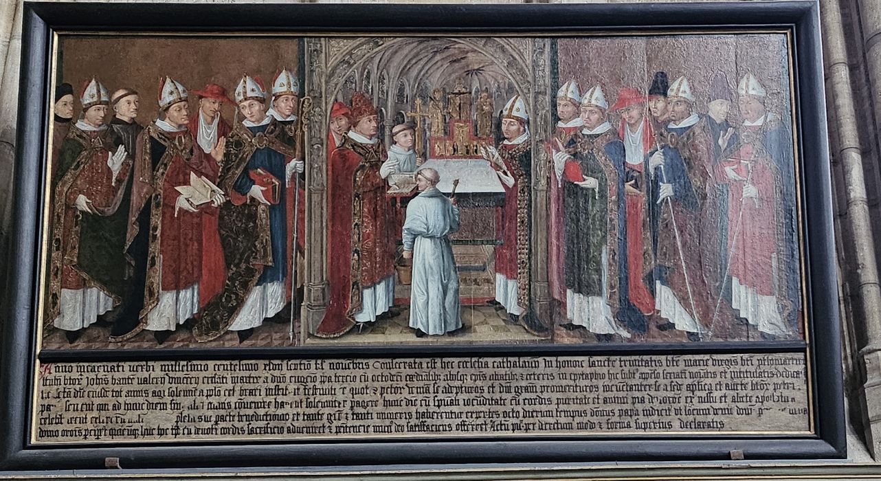 Panneau peint. Le pape devant l'autel procède à la consécration avec autour de lui dix-huit personnages, cardinaux, abbés et clercs.