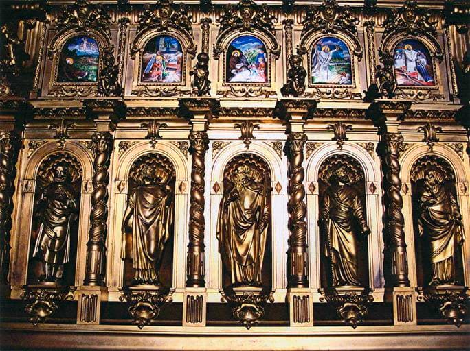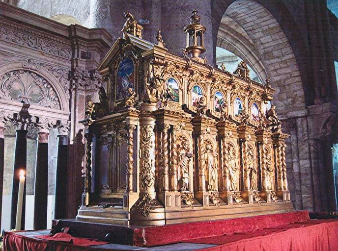 Grande châsse en bronze doré, en forme de basilique à deux niveaux. Le premier niveaux comporte des niches séparées par des colonnes torses, dans lesquelles sont placées des statuettes de saints. Le deuxième niveau présente une série d'arcades ornées de 12 plaques de cuivre émaillé.