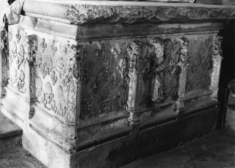 Autel, au centre sainte Barbe sur fonds de fleurs de lys et de roses, pierre sculptée.