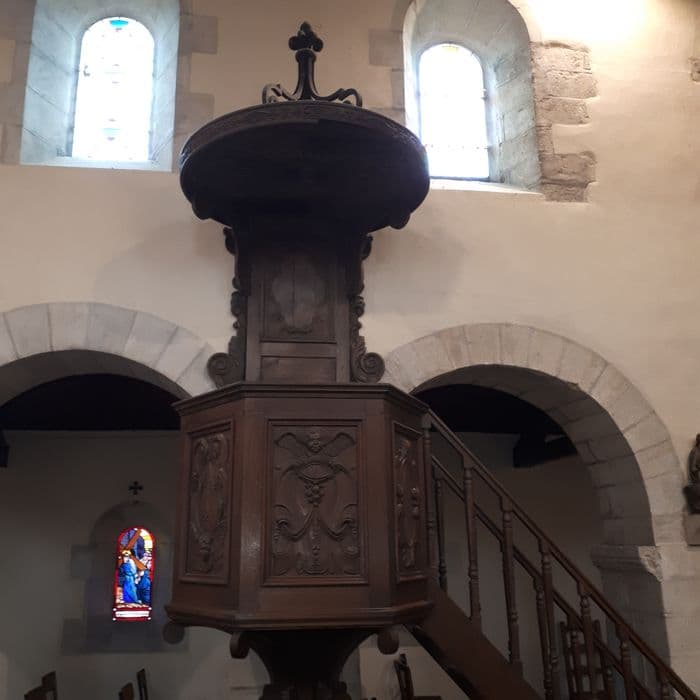 Cinq panneaux décorés de cartouches avec draperie, têtes d'anges et guirlandes. Escalier à fuseau, abat-voix garni au-dessus d'un Saint-Esprit dans une gloire rayonnante.