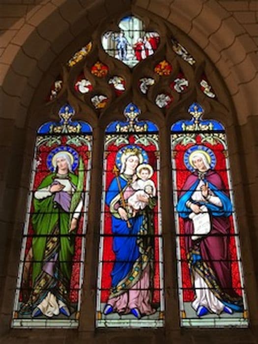 bas-côté sud, 1ère fenêtre, dans le bas ; abside, trois grandes fenêtres, ajours des tympans