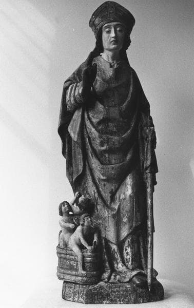 Statue du saint, représenté avec les trois enfants dans le saloir.
