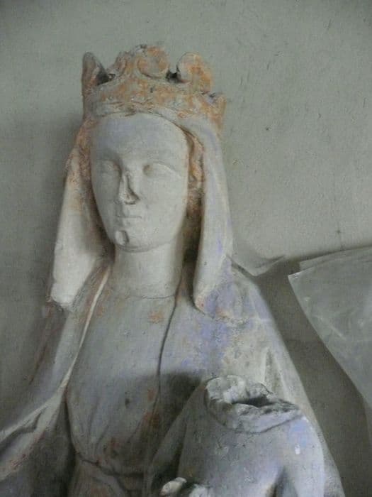 La Vierge est assise sur un banc recouvert d'un coussin. Sur la tête est posée une couronne à fleurs de lys maintenant un voile retombant. Un manteau couvre ses épaules. De la main droite, elle tient un livre appuyé sur son genou. De la main gauche, elle tient l'Enfant. Celui-ci serre entre ses mains une fleur dont la tige passe entre les doigts de la Vierge. Cette statue a dû être enfouis très longtemps (oeuvre mutilée) : le nez de la Vierge est cassé ; la tête de l'Enfant a disparu ; le côté gauche de la statue est brisé ; les pieds de la Vierge ont disparu. Traces bien apparentes de peinture.