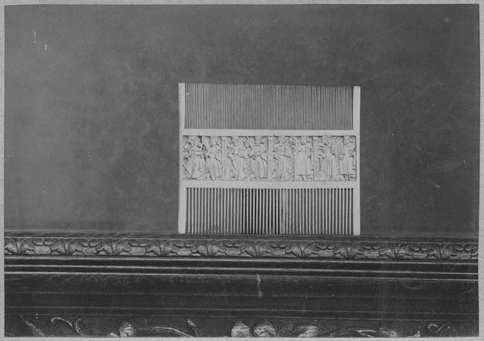 Anciennement daté du 12e siècle. Passait pour avoir servi Saint Bernard. Offert au trésor par M. Haudos en 1861. R. Koechlin indique en 1924 dans la notice 1159 (vol. 2, p.415) : Peigne. Apôtres et Saints. L'Annonciation. Le bandeau, dont le fond est rayé de grossières stries croisées, est divisé, sur une face, en quatre parties par des colonnettes ; au premier compartiment à gauche, sainte Madeleine (?) et un Saint diacre portant une palme ; au second, l'Annonciation ; au troisième, une Sainte portant une palme et saint Jacques le Mineur, au quatrième, deux apôtres, saint Barthélémy tenant un couteau et saint Thomas appuyé sur une lance. Sur l'autre face, des apôtres et des saints. Style pareil à celui des miroirs décorés de la Crucifixion (n°1116 bis, pl. CLXXXVIII, etc.) ; travail barbare. 2e moitié XVe s., Exp. rétr., Paris, 1889, cat. 133 ; Reims, Trésor de la cathédrale.