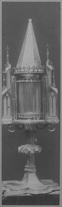 Ostensoir pédiculé, en forme de clocher à cinq faces. Il affecte la forme d'un clocher dont la flèche en cuivre doré est épaulée par deux contreforts ; la tige, interrompue par un noeud à boutons en losange, émerge d'un base à six lobes ; entre les contreforts qui portent le clocher, un tube en cristal se lève à volonté.