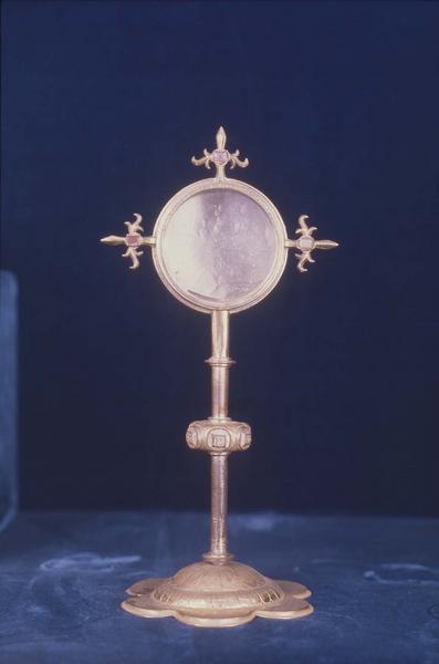 Ostensoir en forme de croix cantonnée de fleurs de lys. Ostensoir sur pied composé d'un socle polylobé, d'une tige à bouton et d'une monstrance circulaire, en verre, cantonnée de trois fleurs de lys formant croix, ornée d'une pierre.