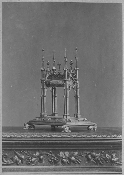 Reliquaire gothique formé de quatre pinacles soutenant un cylindre de cristal, lui-même surmonté d'une garniture en forme d'arcature renversée. L'ensemble repose sur un soubassement formé d'une table montée sur quatre pieds formés d'animaux couchés. La table de soubassement était autrefois décorée de pierres dont il ne subsiste que quelques-unes (au début du 19e siècle, la table était encore ornée de six pierres gravées aujourd'hui disparues : trois cornalines, une pierre bleue, une pierre et un verre).