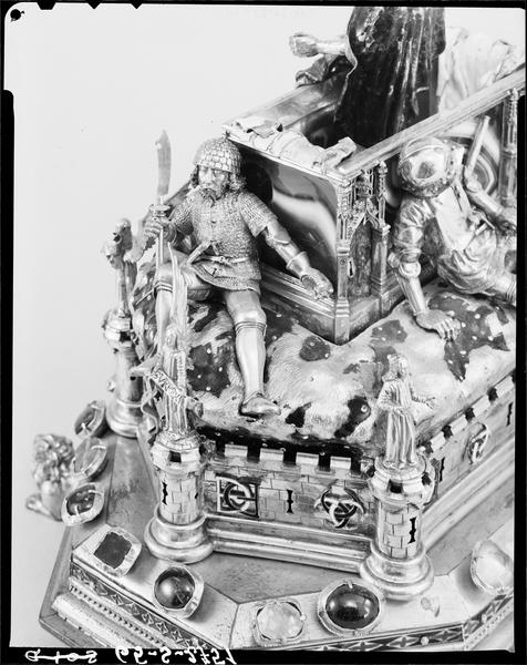 Christ d'argent vêtu d'une draperie, sortant d'un sépulcre de sardonyx orné d'anges d'argent portant les instruments de la Passion. Autour, quatre soldats de cuivre doré sont endormis sur un sol autrefois émaillé, ceinturé d'une muraille d'argent crénelée, à tours surmontées d'anges. L'enceinte repose sur une terrasse également en hexagone allongé portée sur quatre lions, décorée de moulures formant base et corniche sous un biseau, chargé de pierres cabochon montées sur des battes à queues, garnies de quatre griffes. Une frise d'émail champlevé garnit l'intervalle de la base et de la corniche.
