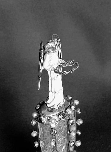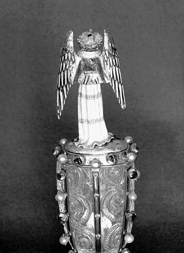 Reliquaire sur socle circulaire formé d'une coupe en cristal de roche montée de six bandes d'or ornées de pierres et de perles. Pied à base circulaire orné également de pierreries et d'émaux. Sur le couvercle, statutte d'ange d'or émaillé en blanc, tenant la couronne d'épine.