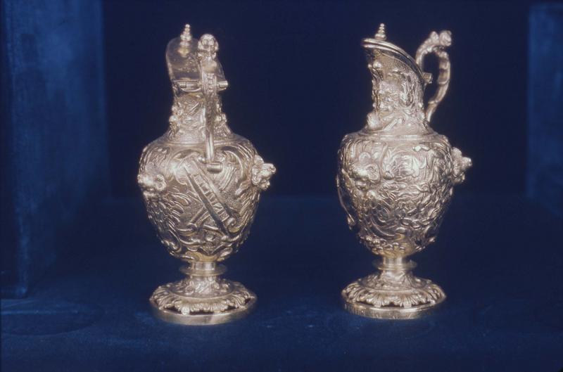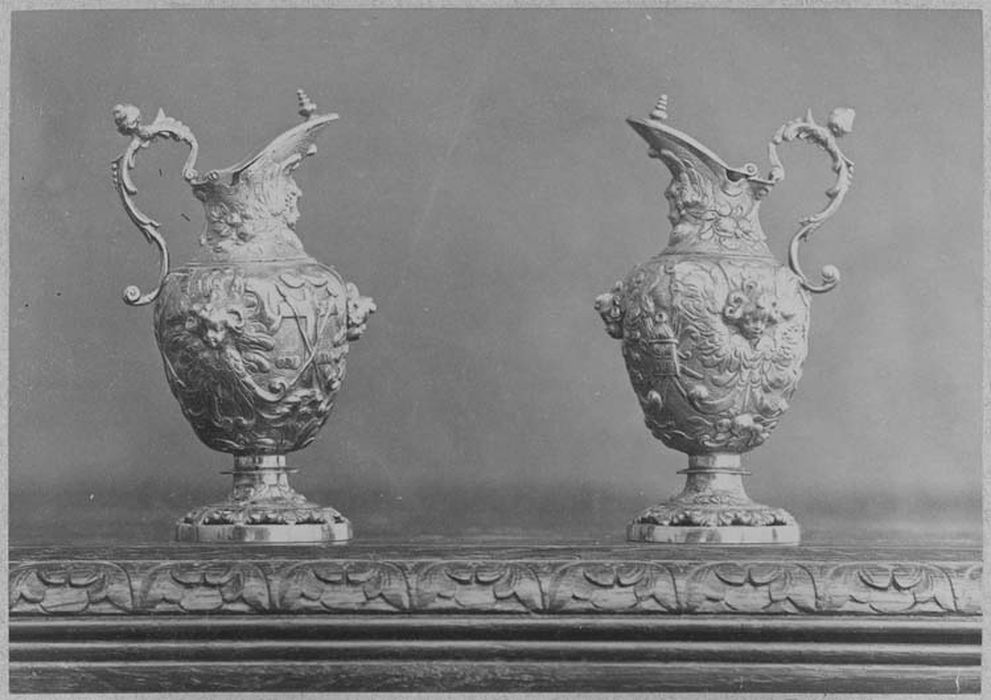 Sur les burettes sont ciselés en relief des têtes d'anges et les instruments de la Passion. Au centre du plateau sont gravées les armes de la famille de La Salle.