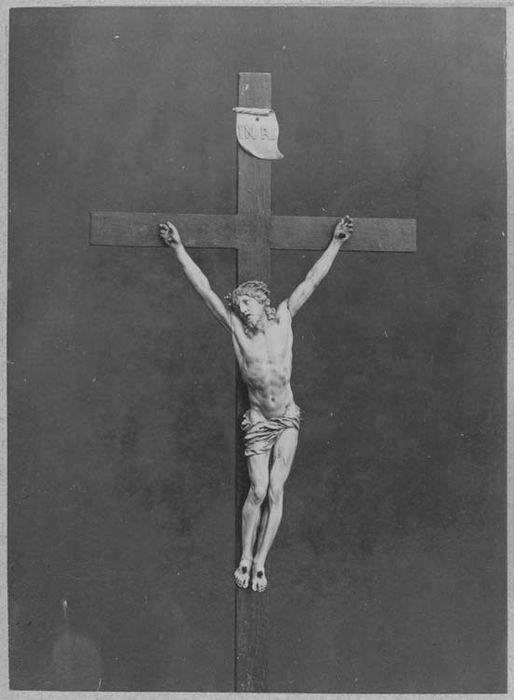 Christ. Christ en ivoire fixé à une croix de bois. Le Christ est couronné d'épines et ceint d'un voile flottant autour des reins. Les pieds sont cloués séparément. Les bras sont sculptés dans un autre bloc d'ivoire que le corps. Les cheveux sont longs et frisés ainsi que la barbe, et le visage a une expression de souffrance sans horreur.