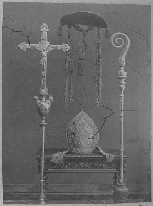 Croix archiépiscopale terminée par des fleurs de lys. Armes de France ciselées sur le bouton en forme d'urne. La croix est plate, ornée de fleurs de lys aux extrémités ; le bâton de la croix (quatre éléments emboîtés) est semé de fleurs de lys.