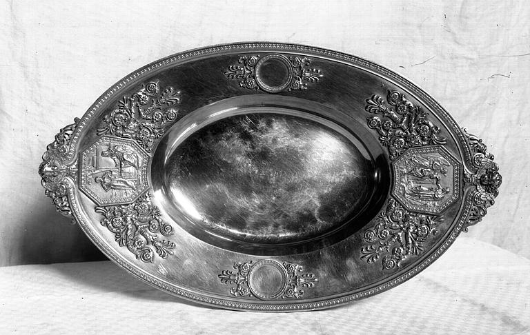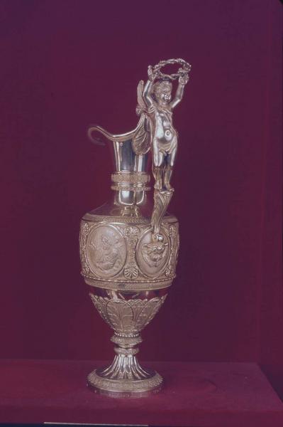 Aiguière ornée de médaillons représentant les quatre évangélistes, et son bassin. Aiguière : les quatre évangélistes sont dans des médaillons ovales ; ange tenant la couronne d'épines sur l'anse. Bassin : médaillons octogonaux avec Saint Jean-Baptiste baptisant le Christ et Jésus au puits de Jacob, ornements rapportés, fixés par des rivets.