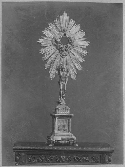 Gloire en vermeil, enrichie depuis son don, de sept topazes d'une très belle eau ; la tige, en bronze doré, est formée par un ange ayant à ses pieds le divin agneau et le livre à sept sceaux. Le socle quadrangulaire est richement ciselé. Sur un côté est présenté la Cène, de l'autre, un médaillon de la Sainte-Vierge. Quatre pieds en forme de pattes de lion.