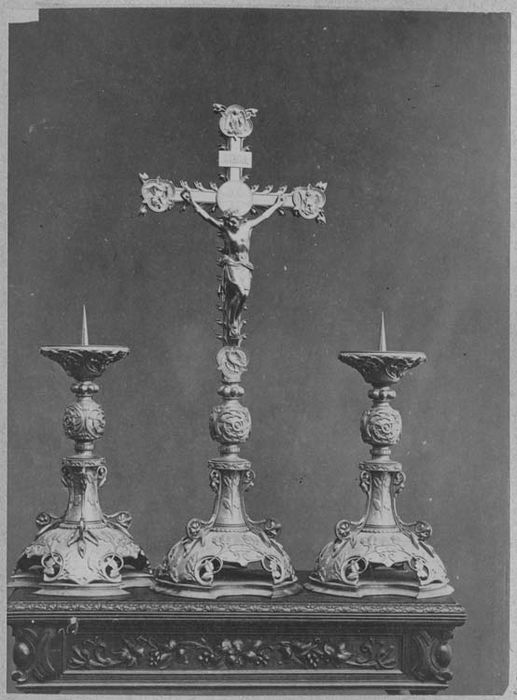 Quatre chandeliers moindres et croix d'autel. Ces objets, remarquables par l'exécution et par la dorure, furent aussi donnés par Charles X. Ils ont servi pour la chapelle du Trône, au moment du sacre, et décorent maintenant la chapelle de l'archevêché (en 1861).