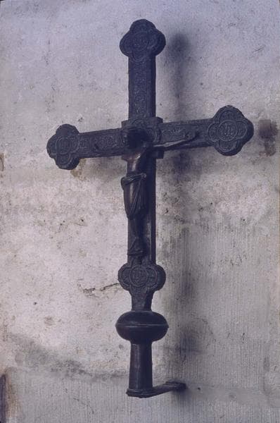 Croix remontée sur un support de bronze récent. Christ en croix, bronze coulé, sur une croix de bronze estampée décorée de rinceaux. Extrémités de la hampe et de la traverse en forme de quadrilobe avec inscription IHS au centre.