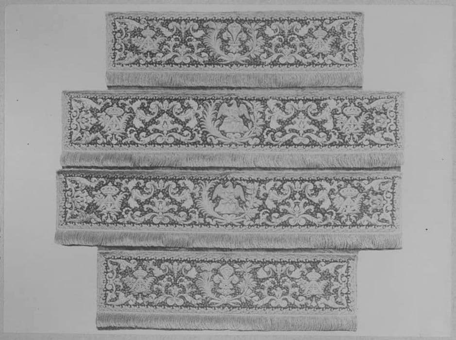Pentes brodées d'un dais portant le monogramme de Louis XIII et d'Anne d'Autriche, or et soie. Quatre pentes avec leurs glands.