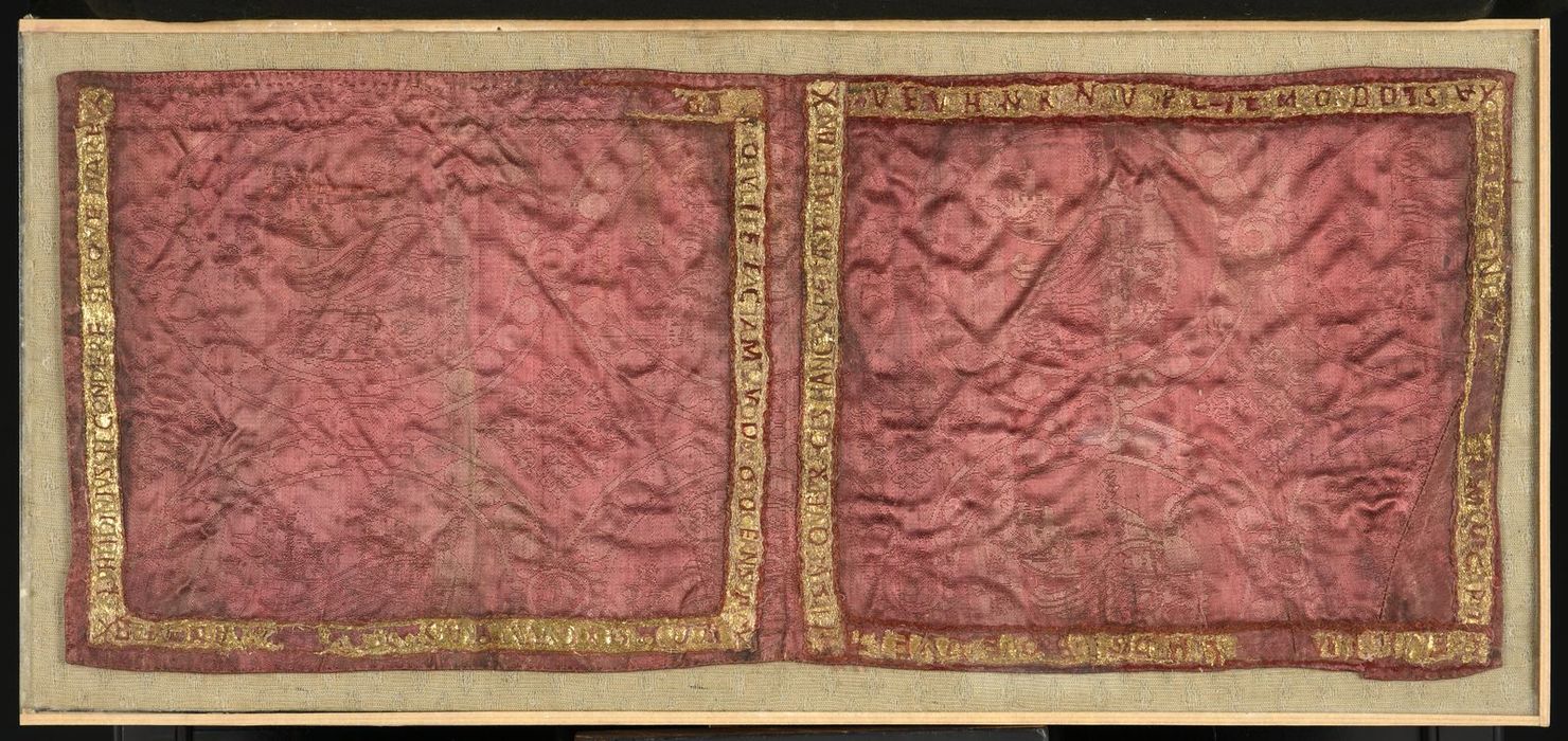 Coussin brodé par Aupais, soeur de Charles le Chauve pour la sépulture de saint Remy (Alpheidin est une forme grecque de son nom). Ce coussin a été extrait de la châsse du saint le 12 août 1942.
