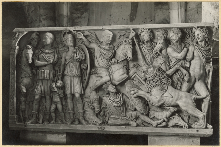 Sarcophage antique, dit tombeau de Jovin, marbre. Cuve tombale dont la face principale est ornée d'une scène de chasse en haut relief. Au centre, un cavalier s'apprête à lancer un javelot sur un lion attaquant un homme à terre. A gauche, un homme en tenue de militaire romain est encadré entre une femme casquée et un cheval tenu par personnage à bonnet phrygien. A droite, deux personnages.