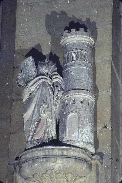 Figuration d'une femme en pied, vêtue d'une robe à plis profonds avec enroulement à la taille, tenant un livre ouvert sur son flanc droit. A ses côtés, tour crénelée avec porte en plein cintre. Sculpture acéphale.