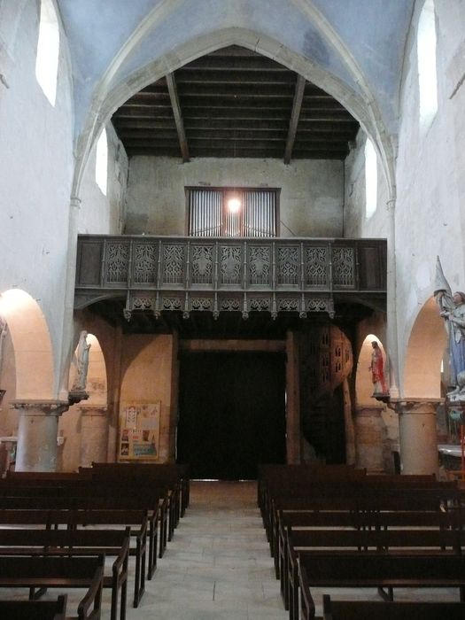 Tribune d'orgue composée de onze panneaux dont neuf sont ajourés. Certains comportent des écussons et les pendentifs sont ornés de personnages sculptés.
