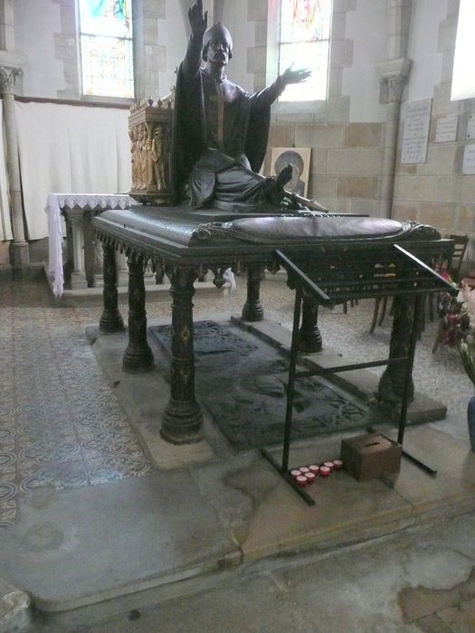 Dalle funéraire à effigie en demi-relief. Effigie en demi-relief, mais très mutilée par les balles des alliés en 1814.