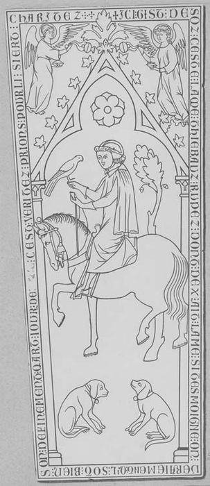 Dalle funéraire à effigie gravée. Le guerrier tient un faucon sur le poing.