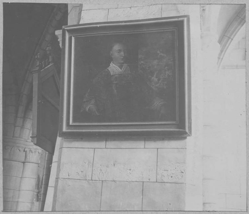 Saint Laurent représenté jusqu'à la ceinture, dans un riche vêtement d'archidiacre, tient dans la main droite la palme du martyr. Dans le fond du tableau, est représentée la scènes de son martyre.