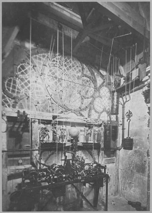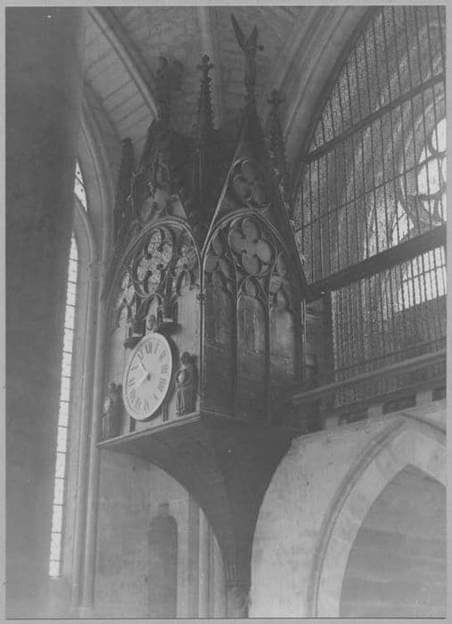 Horloge du choeur. Buffet de bois en forme de quatre pignons décorés d'arcatures à trois lancettes trilobées et d'un quatre-feuille et surmonté de pinacles. Sur la façade, quadran circulaire entre deux statues. Au-dessous, encorbellement en bois sans décor, reposant sur un corbeau en forme de cariatide. Au-dessus du cercle de l'horloge, et immédiatement sous les arcatures du fenestrage, sont percées quatre ouvertures d'où sortent et où rentrent les divers personnages qui marquent les heures. Au-dessus de la décoration en portail et sous le pignon que surmonte un ange sculpté, est fixée une cloche sur laquelle deux petits personnages frappent les heures.