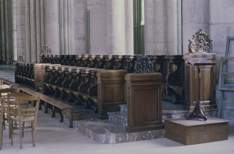 Deux ensembles de stalles disposées parallèlement à la nef, formant deux fois deux rangées de 20 et 26 miséricordes. Miséricordes et accotoirs, ainsi que les extrémités, sont décorés d'un décor floral sculpté. L'ensemble repose sur un soubassement dallé de carreaux de marbre rouge.