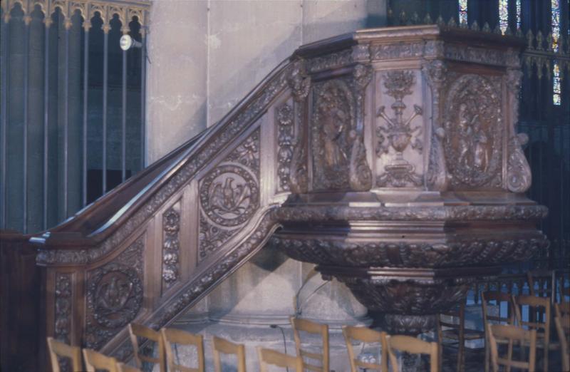 Chaire à prêcher de l'arrière-choeur. Sur la cuve, trois panneaux sculptés avec des scènes de la vie de sainte Thérèse (sainte abbesse). Chaire formée d'un escalier et d'une cuve. Sur la rampe, panneaux sculptés représentant un aigle aux ailes déployées.