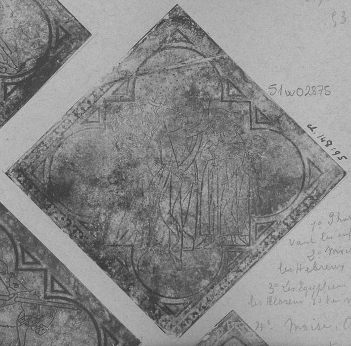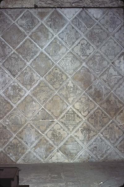 Dallage de la chapelle Saint-Eloi, pierre incrustée de plomb. Dallage formé de carreaux à figures en creux et emplies de plomb. Quarante-huit compartiments carrés présentant des scènes de l'Ancien Testament.