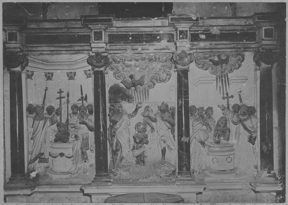 retable, 3 bas-reliefs de la chapelle des fonts baptismaux : le Baptême de Clovis, du Christ et de Constantin