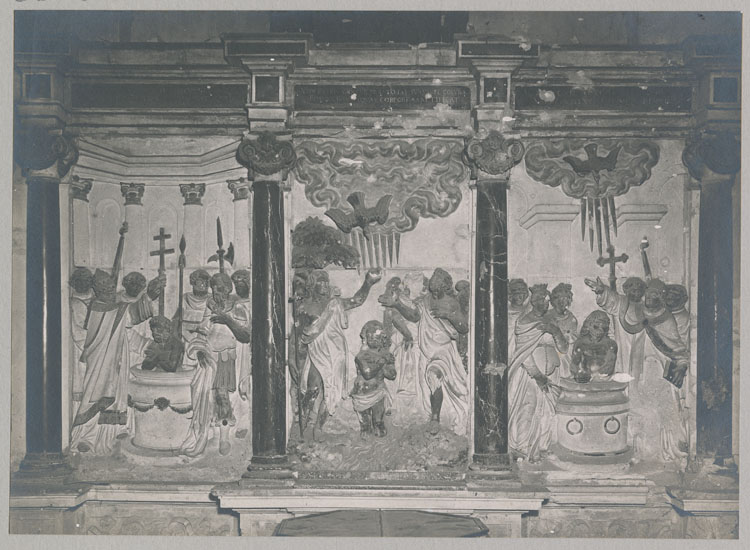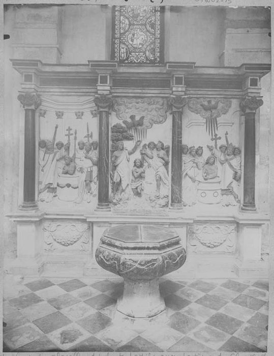 Retable de la chapelle des fonts baptismaux, baptême de Clovis, du Christ et de Constantin, pierre sculptée et polychromée. Trois scènes de baptême dans un encadrement : Christ au centre, Constantin à gauche, Clovis à droite. Quatre colonnes de marbre à chapiteaux composites sur soubassement et surmontées d'un entablement.