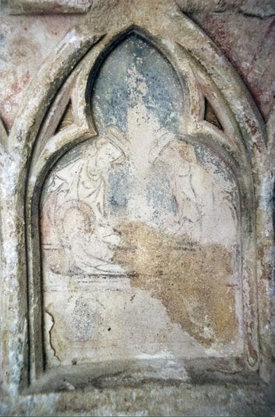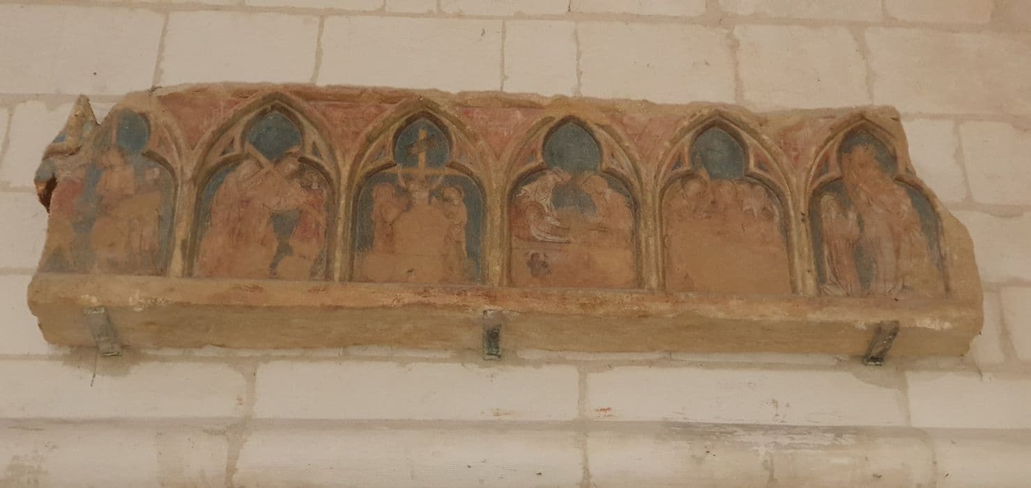La Passion, fragment de retable, six scènes peintes, pierre polychrome. Pierre moulurée et peinte. Fragment de retable composé de six arcatures juxtaposées dans lesquelles s'inscrivent six scènes de la Passion du Christ : Ecce Homo, le Portement de croix, la Crucifixion, la Mise au tombeau, les Saintes femmes au tombeau et une dernière scène peu lisible, qui peut être une Apparition du Christ après la Résurrection.