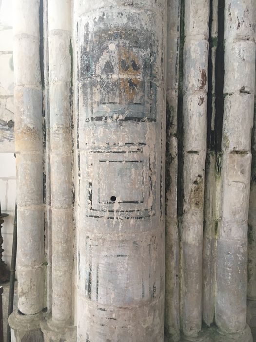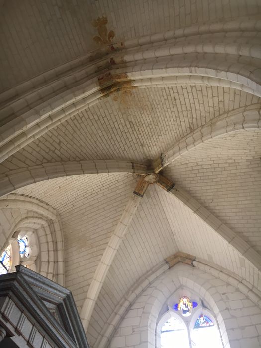 Fragments de peintures murales des voûtes : décor avec ornements végétaux, armoiries, croix de consécration.