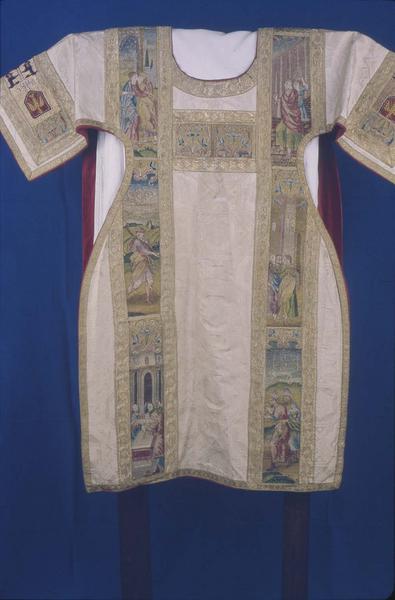 Tunique. Dalmatique de soie beige avec broderies représentant des scènes de la vie de la Vierge bordées de galons d'or.