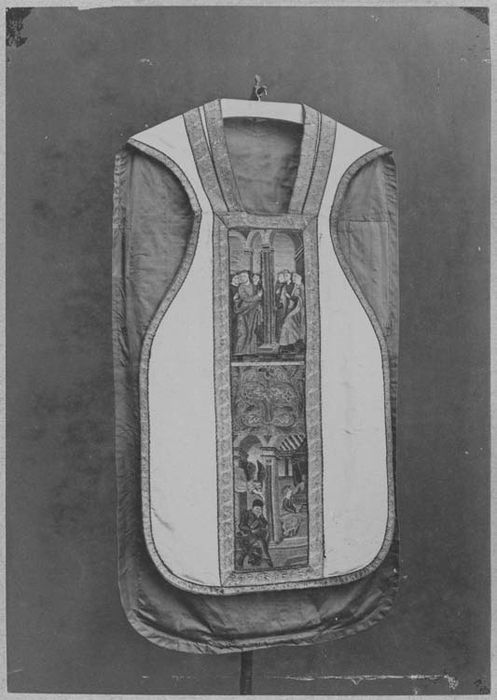 Chasuble de soie ou satin beige avec trois scènes brodées représentant l'Annonce aux bergers, la Nativité et l'Adoration des mages. Sur la face avant, deux scènes, dont le Songe de Joseph.
