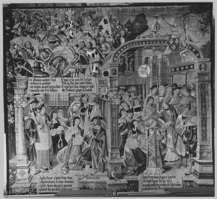 pièce murale de la tenture de la vie de saint Remy : Bataille de Tolbiac (La), Enseignement de Clovis (L'), Baptême de Clovis (Le)